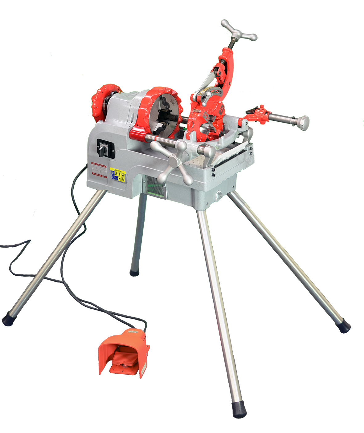 Резьбонарезной станок FP50AV CE – изготавливается в Японии, подходит для нанесения конической и цилиндрической резьбы типа BSPT (образованной контуром, вращающимся по – часовой стрелке) на трубах диаметром от 12 мм до 50 мм (1/4-2 дюймов). Для нарезания резьбы на болтах, подойдут болты диаметром от 8 мм до 52 мм. Небольшой, но мощный электродвигатель 1600 Вт и напряжением 220 В. Бестселлер среди компактных машин, весит всего 48 кг. Простота в использовании и высокая производительность. Размер трубы можно регулировать простым поворотом гайки рычага. Для изменения диаметра и длины резьбы на корпусе размещен регулировочный рычаг. Система автоматической подачи резьбонарезного масла непосредственно к режущим гребенкам продлевает срок службы инструмента, быстро охлаждая их и не допуская перегрева. Прекрасно совместим с желобонакатчиками REX RG-R0, REX RG-RH. Используя резьбонарезную головку GV/BVD50A можно снимать фаску и нарезать желобки. Инструмент производится в Японии из качественного сырья и имеет долгий эксплуатационный срок.